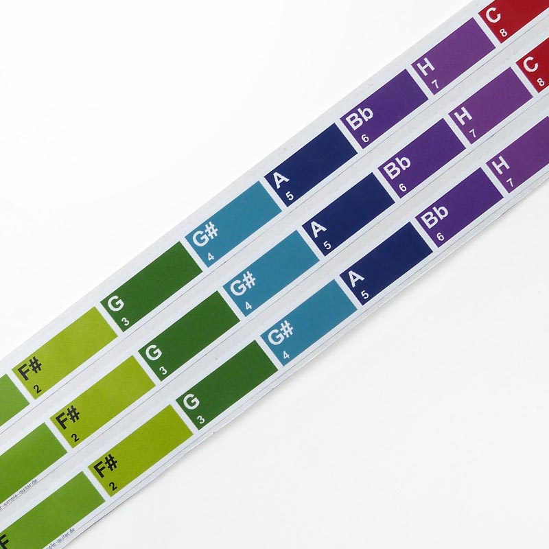Sticky™ heißt der bunte Farbaufkleber von Super Simple Guitar™, der seitlich auf den Hals deiner Gitarre aufgeklebt wird. Beim Kauf eines Buches bekommst du ihn gratis für diese drei Griffbrettgrößen (Mensuren) mitgeliefert: 62,8 cm, 64,8 cm, 66,0 cm